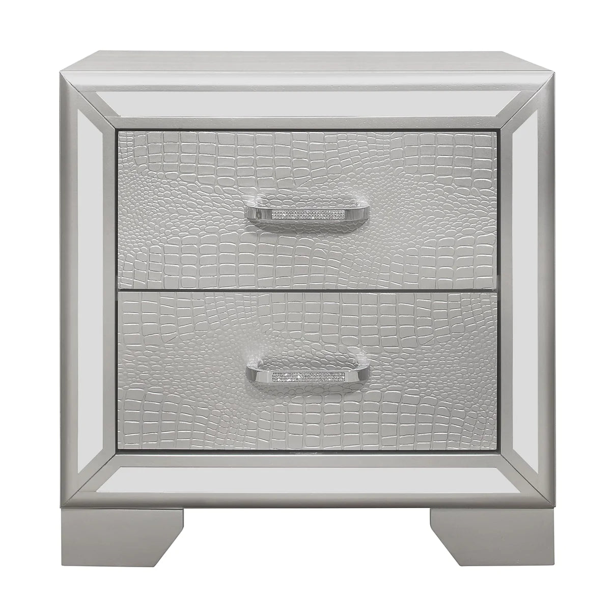Elegant touches abound with the design of the Aveline Collection. Alligator embossed veneer covers the collection and is finished in silver, an elegant palette that beautifully pairs with your bedroom’s accessories and bedding. The headboard is centered with a silver faux leather panel that features button tufting and LED backlighting. Each piece of the collection is framed with mirror trim, while the drawers are fronted with chrome-finished faux-diamond inlay bar hardware, each accent a perfect decorative touch to reflect your glamorous style.