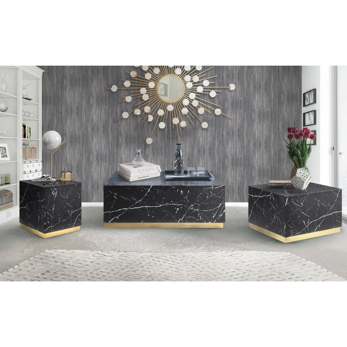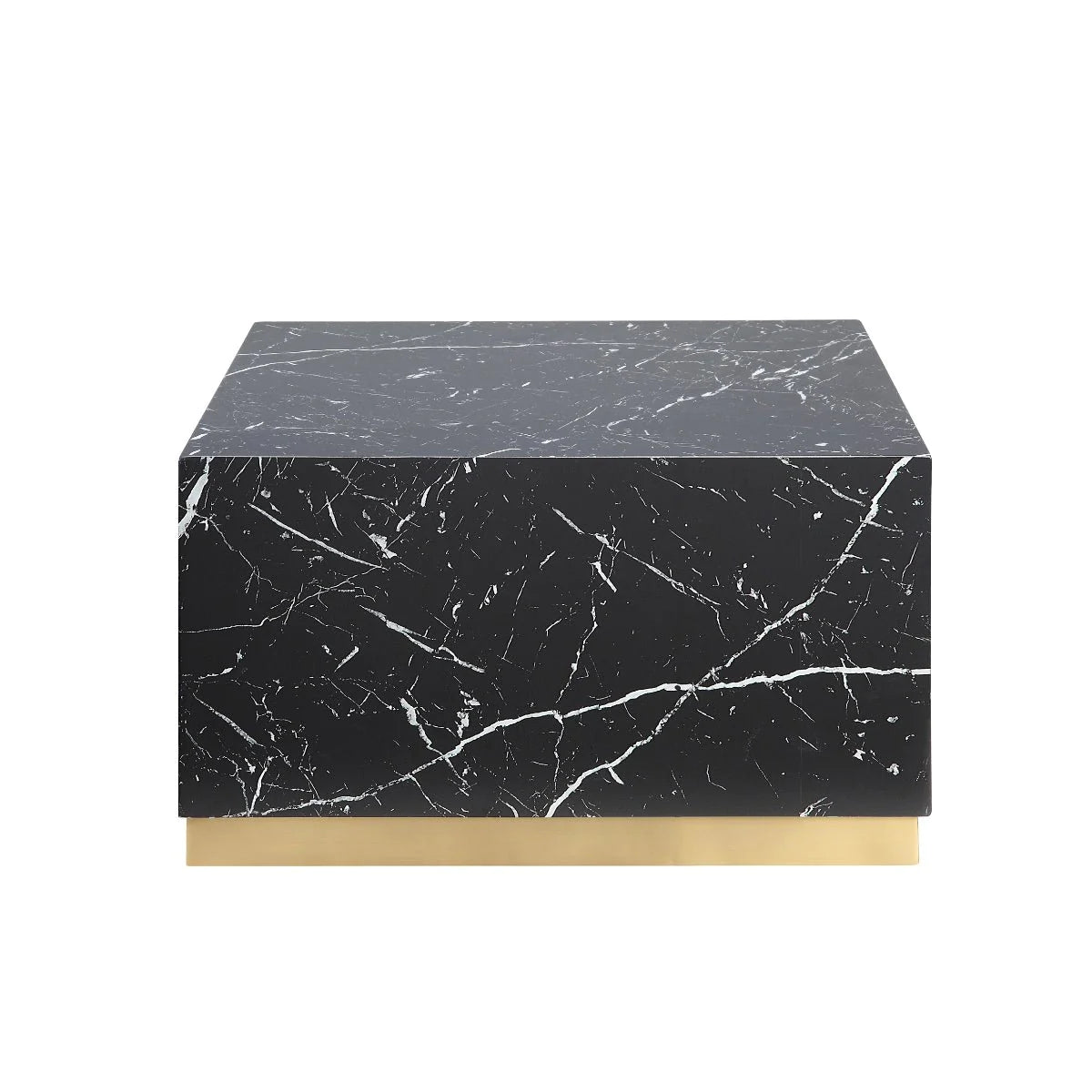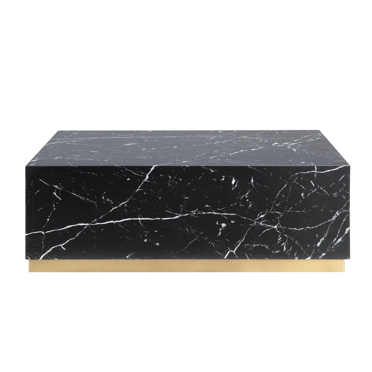 With the captivating Astraia occasional collection, your living area will stand out and impress visitors. Thanks to its distinctive solid cube shape and stunning imitation marble finish, this eye-catching huge square coffee table makes a striking statement. White veining runs through the striking black, which is contrasted by the metal base's brushed gold finish for an added bit of glitz. The table is shielded from stains and scratches, and the surface is made to be simple to clean and maintain. A clear matte top coat lends a slight sheen and durability. Your Astraia table isn't as heavy as it may seem, thanks to hidden casters that make it simple to move the table whenever necessary