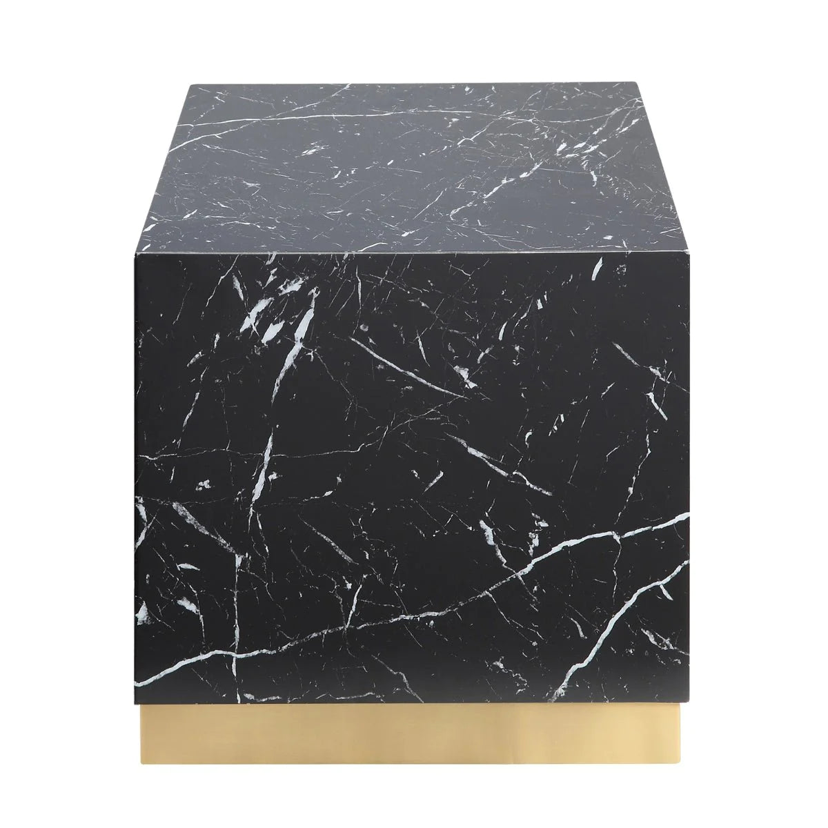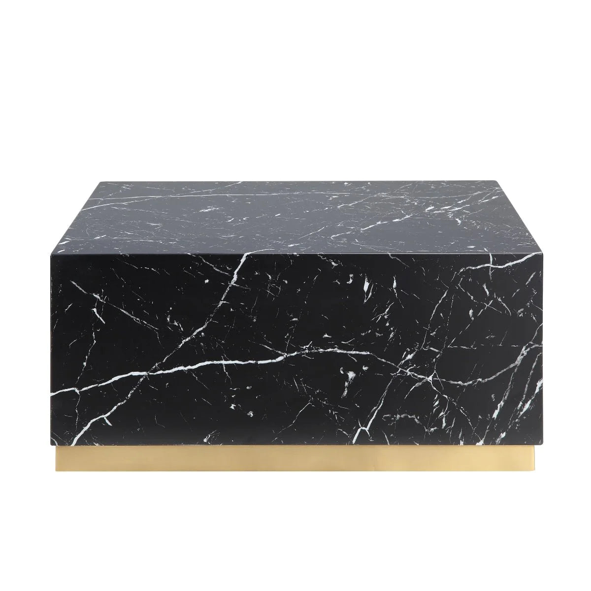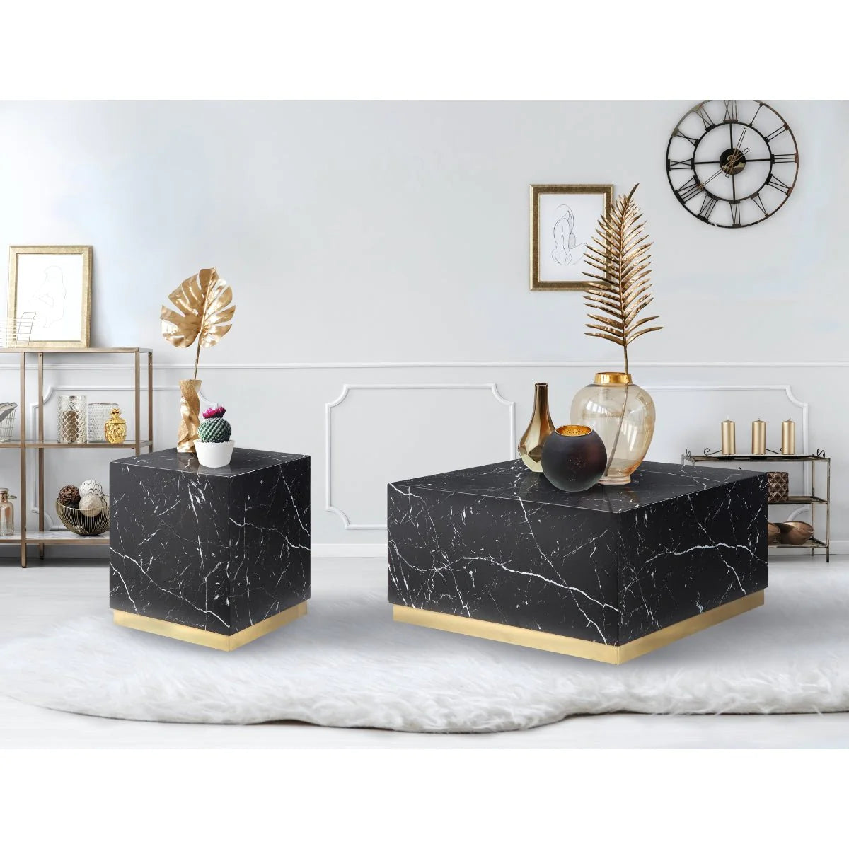With the captivating Astraia occasional collection, your living area will stand out and impress visitors. Thanks to its distinctive solid cube shape and stunning imitation marble finish, this eye-catching huge square coffee table makes a striking statement. White veining runs through the striking black, which is contrasted by the metal base's brushed gold finish for an added bit of glitz. The table is shielded from stains and scratches, and the surface is made to be simple to clean and maintain. A clear matte top coat lends a slight sheen and durability. Your Astraia table isn't as heavy as it may seem, thanks to hidden casters that make it simple to move the table whenever necessary