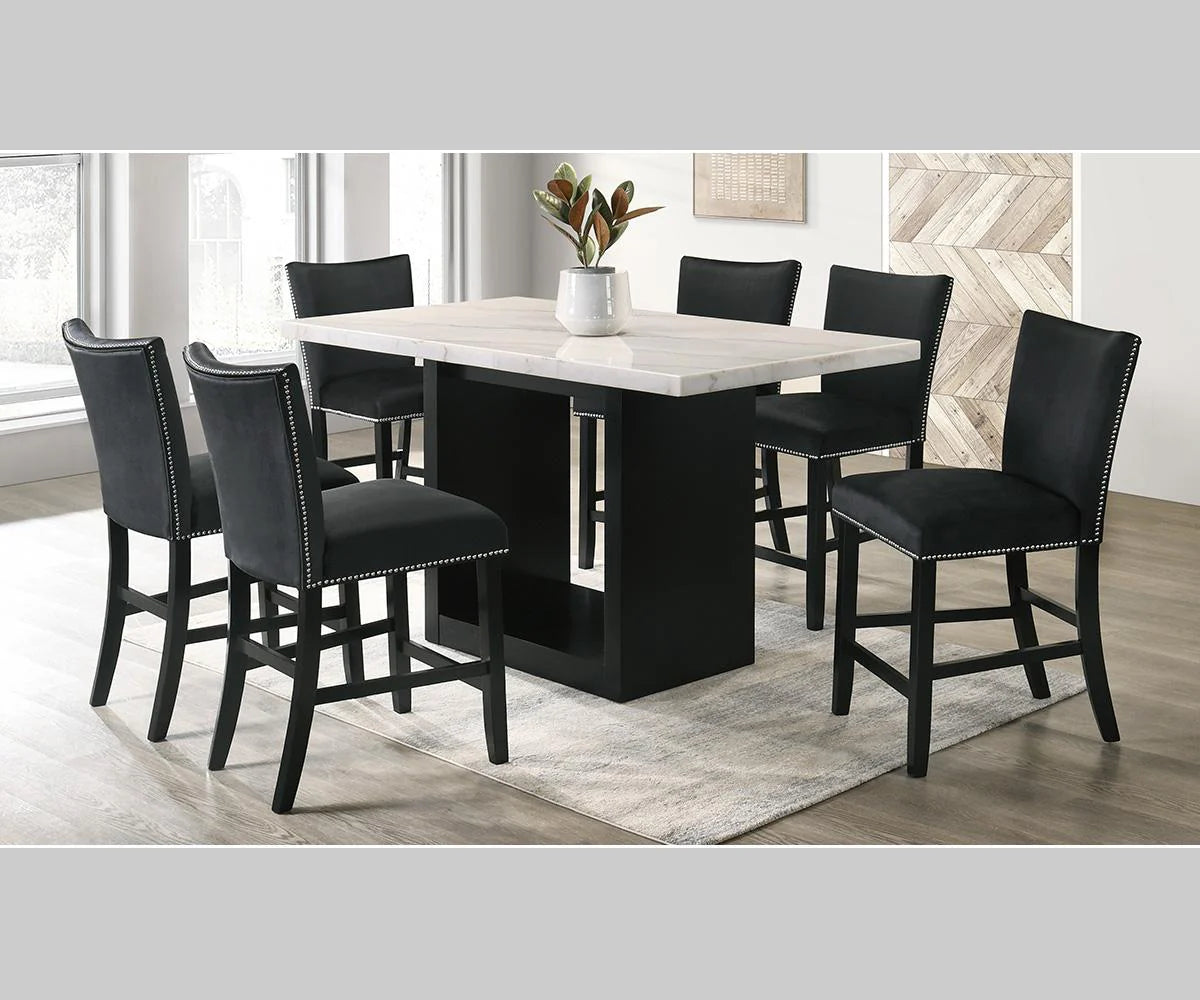 Folando Real Marble Pub Table with 6 Black Chairs P6335 KW-365