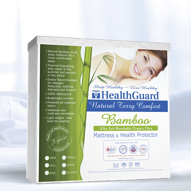 HealthGuard™ Bamboo Terry Mattress protectors place a soft, comfortable, protective barrier between you and the build-up of harmful particles inside your mattress. HealthGuard's exclusive NO-MITE® waterproof, breathable barrier maintains a cleaner, fresher, healthier bed and is doctor recommended for allergen reduction, asthma, allergies and eczema. HealthGuard™ Protectors eliminates mold, mildew, fungus, bacteria, dust mites and dust mite allergens – both on the sleeping surface and inside your mattress and pillow. Effective on both new and old mattresses, HealthGuard™ Mattress Protectors slide on and off like any fitted sheet and can be machine washed in hot water and tumbled dry. A stretch-net-skirt provides added convenience. For total protection and comfort, use with a HealthGuard™ Pillow Protector.