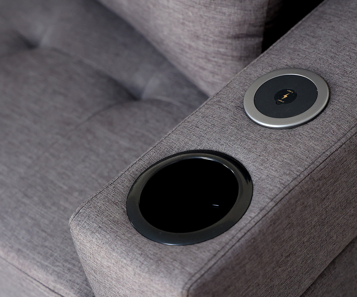 Upgrade your living space with the Newton Reversible Tufted Fabric Sectional! This sleek and stylish sectional includes a built-in wireless charger and USB/C port for convenience. Enjoy movie nights with cupholders on both arms and accent pillows for fashionable comfort. Available in grey fabric.